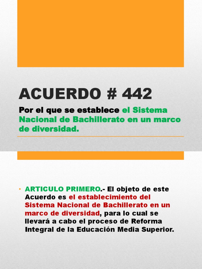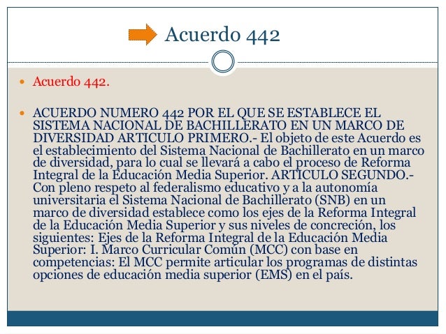 Acuerdo 442 El acuerdo 442 establece que la educacin media superior enfrenta desafos que slo podrn ser atendidos si este tipo educativo se desarrolla con una identidad definida que brinde a sus distintos actores la posibilidad de avanzar ordenadamente hacia los objetivos propuestos. Reporte de lectura Acuerdo 442 ACUERDO 442 POR MEDIO DEL CUAL SE ESTABLECE EL SISTEMA NACIONAL DE BACHILLERATO En los dos primeros artculos del acuerdo menciona que se llevar a cabo el proceso de Reforma Integral de la Educacin Media Superior con el fin de establecer el Sistema Nacional de Bachillerato en un marco de. Resumen Acuerdo 442 Bachillerato Una competencia es el conjunto de habilidades conocimientos y actitudes en un contexto especfico.